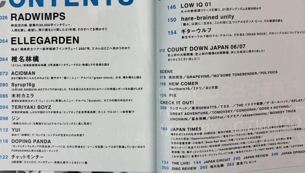 表紙巻頭=RADWIMPS 野田洋次郎、挫折と救済の3万字インタヴューその他=ELLEGARDEN、椎名林檎、ACIDMAN、Syrup16g、木村カエラ、TERIYAKI BOYZ、ジン、YUI、DOPING PANDA、チャットモンチー3回連続「ひとりだけ」インタヴュー:高橋久美子<とまどい>篇、LOW IQ 01、hare-brained unity、ギターウルフ 等