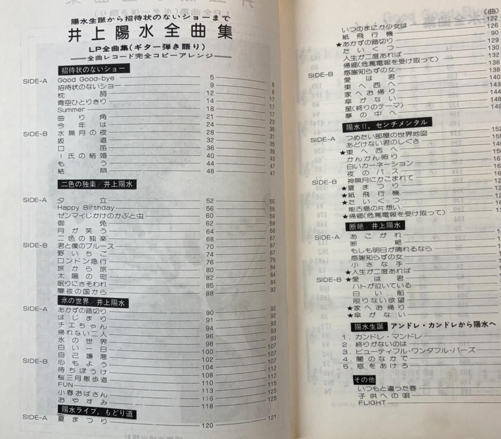 井上陽水全曲集 陽水生誕から招待状のないショーまで 全曲ギター伴奏楽譜 国際楽譜出版社 1975年 楽譜