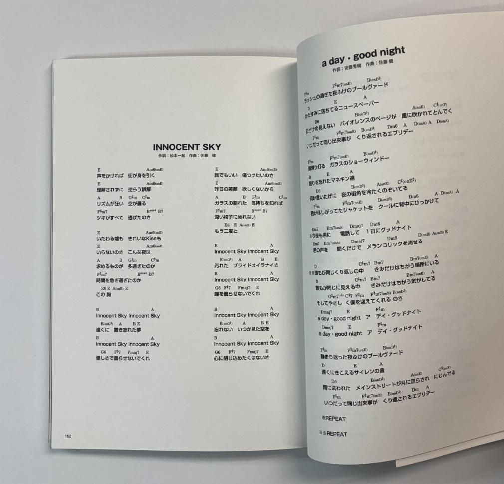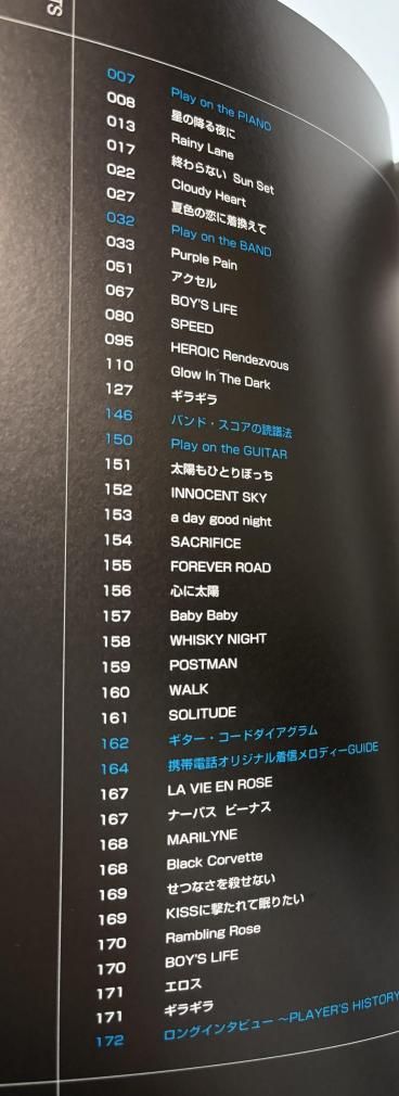 ピアノ譜・星が降る夜に・Rainy Lane・Cloudy Heart・終わらないSun Set・夏色の恋に着換えてバンド譜・Glow in The Dark・ギラギラ・アクセル・BOY'S LIFE・SPEED・Purple Pain・HEROIC Rendezvousコード譜・SOLITUDE・INNOCENT SKY・a day good night・心に太陽・太陽もひとりぼっち・SACRIFICE・FOREVER ROAD・WALK・Baby Baby・POSTMAN、・WHISKY NIGHT着メロ・LA VIE EN ROSE・Black Corvette、・Rambling Rose・BOY'S LIFE、・せつなさを殺せない・MARILYNE・ナーバスビーナス・エロス、・KISSに撃たれて眠りたい・ギラギラ