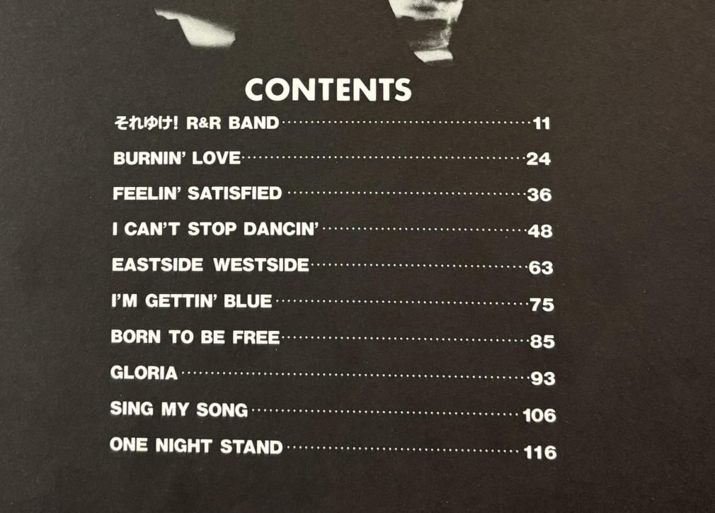 全10曲 それゆけR&R BAND / BURNIN' LOVE / FEELIN' SATISFIED / I CAN'T STOP DANCIN' / EASTSIDE WESTSIDE / I'M GETTIN BLUE / BORN TO BE FREE / GLORIA / SING MY SONG / ONE NIGHT STAND  シンコーミュージック
