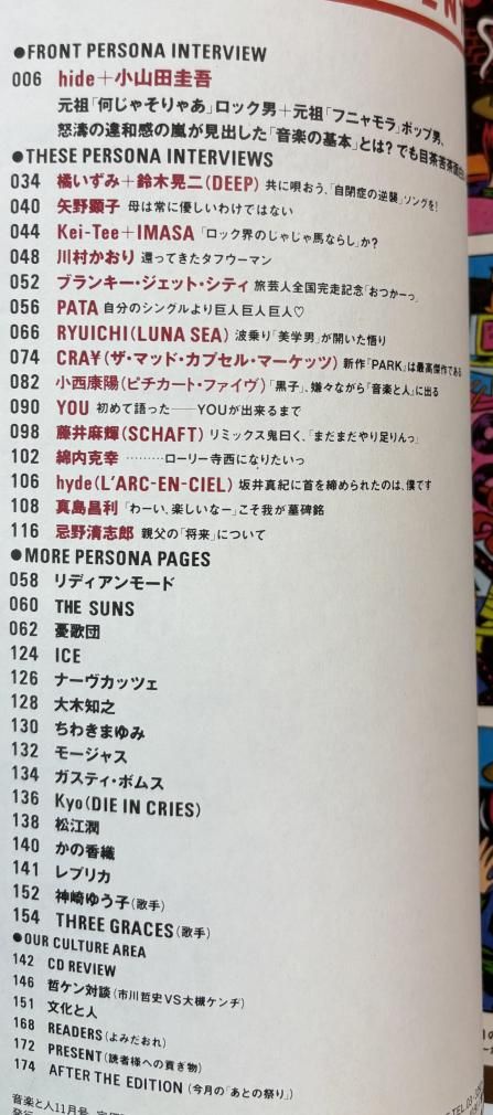 hide + 小山田圭吾22頁 / 川村かおり ブランキージェットシティ BLANKEY JET CITY PATA10頁 RYUICHI(LUNA SEA)8頁 ピチカートファイヴ(小西康陽) ラルクアンシエル L'Arc-en-Ciel(hyde) 2頁 真島昌利 忌野清志郎