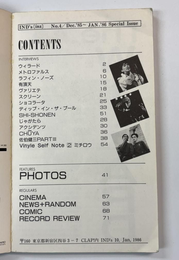 IND'S 4号 インズ 1985年12月-1986年1月 ラフィン・ノーズ / P-MODEL 平沢進 ウィラード じゃがたら 有頂天 ミチロウ