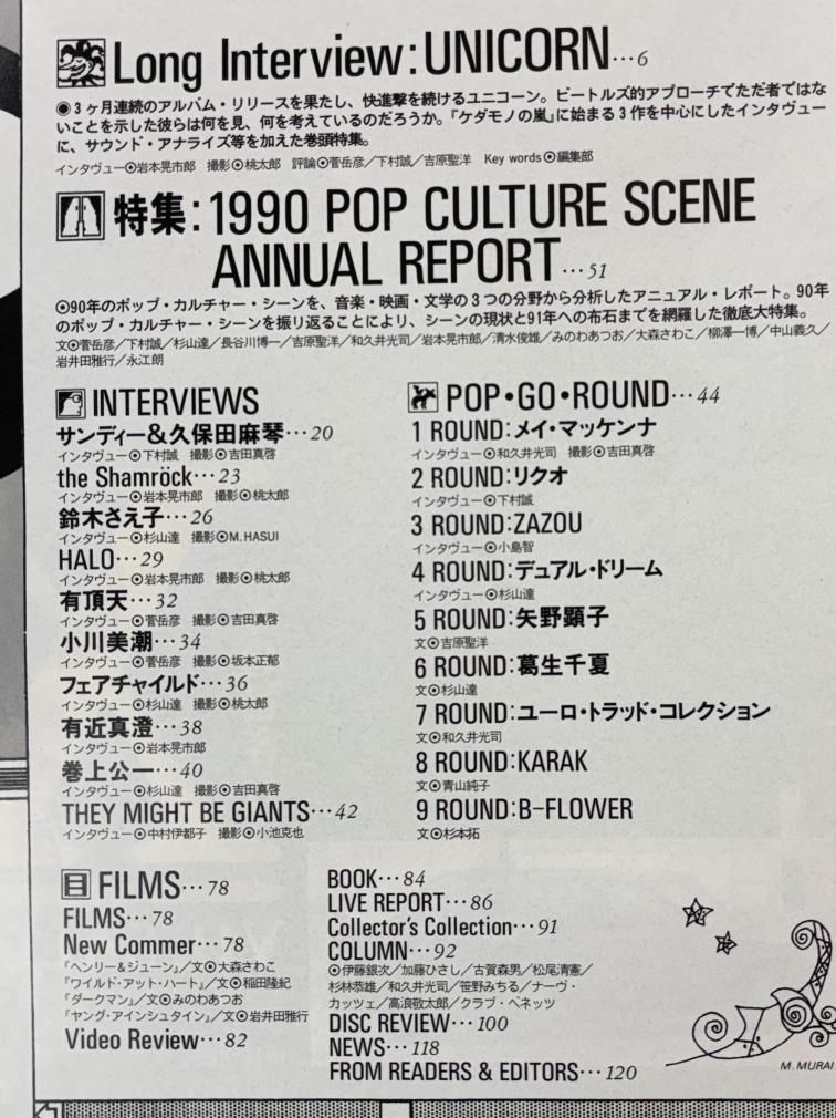 ユニコーン・ロング・インタビュー/サンディー+久保田麻琴、鈴木さえ子、HALO、有頂天、小川美潮、フェアチャイルド、巻上公一、ゼイ・マイト・ビー・ジャイアンツ