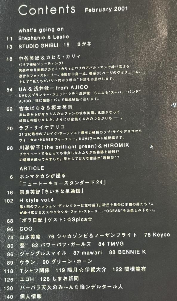 H 39 2001年2月 中谷美紀×カヒミ・カリィ 30頁 / AJICO ラブ・サイケデリコ 川瀬智子& HIROMIX UA & 浅井健一