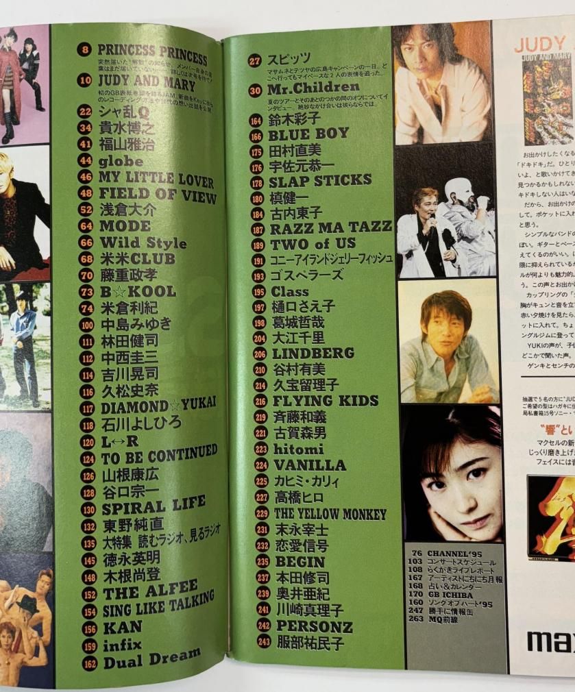 JUDY AND MARY / Mr.children プリンセス プリンセス シャ乱Q 浅倉大介 福山雅治 貴水博之 MY LITTLE LOVER コーネリアス cornelius DREAMS COME TRUE ドリームズカムトゥルー FIELD OF VIEW globe MODE 藤重政孝 米倉利紀 中島みゆき 吉川晃司 久松史奈 L-R To Be Continued 山根康広 スパイラルライフ SPIRAL LIFE 木根尚登 アルフィー SING LIKE TALKING KAN スピッツ 古内東子 ゴスペラーズ リンドバーグ 谷村有美 斉藤和義 hitomi カヒミカリィ イエローモンキーBEGIN パーソンズ