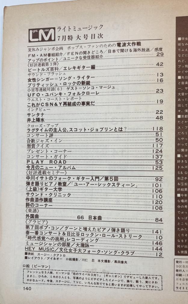 ライトミュージック 1974年7月 スージークワトロ / ビートルズ 小室等 サンタナ 赤い鳥 NSP 荒井由実 松任谷由実 楽譜